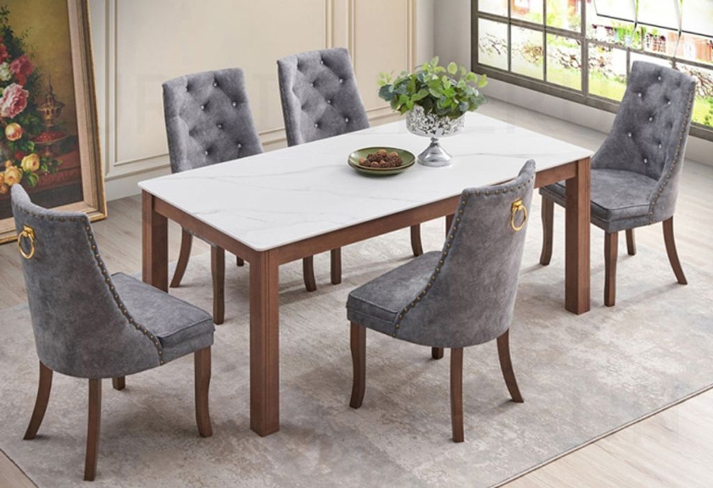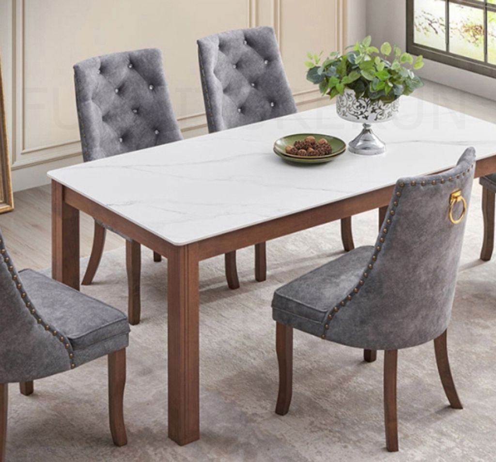 Table - H750 x D900 x W1800MM Sintered Stone Top Chair - H990/485 x D610 x W580MM Gold, Slate GreyWalnut