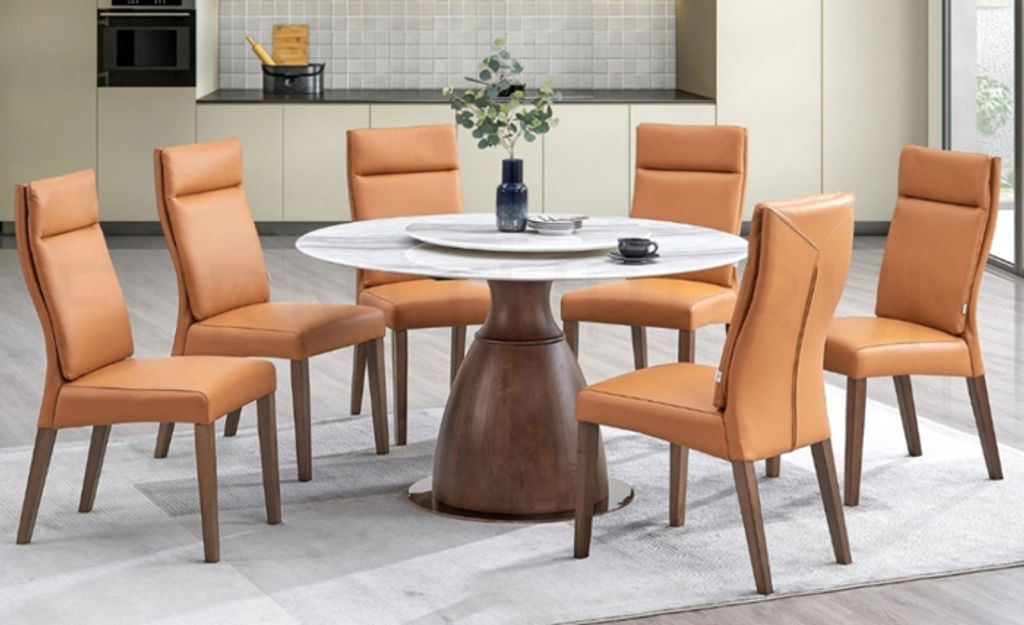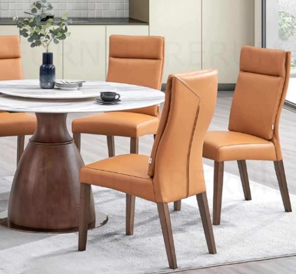 Table - H750 x Diam. 1300MM Roving Top - Diam. 700MMCrystal Marble Top + Oak Solid Wood Frame Chair - H980/495 x D590 x W460MM Burnt Orange Cow Leather