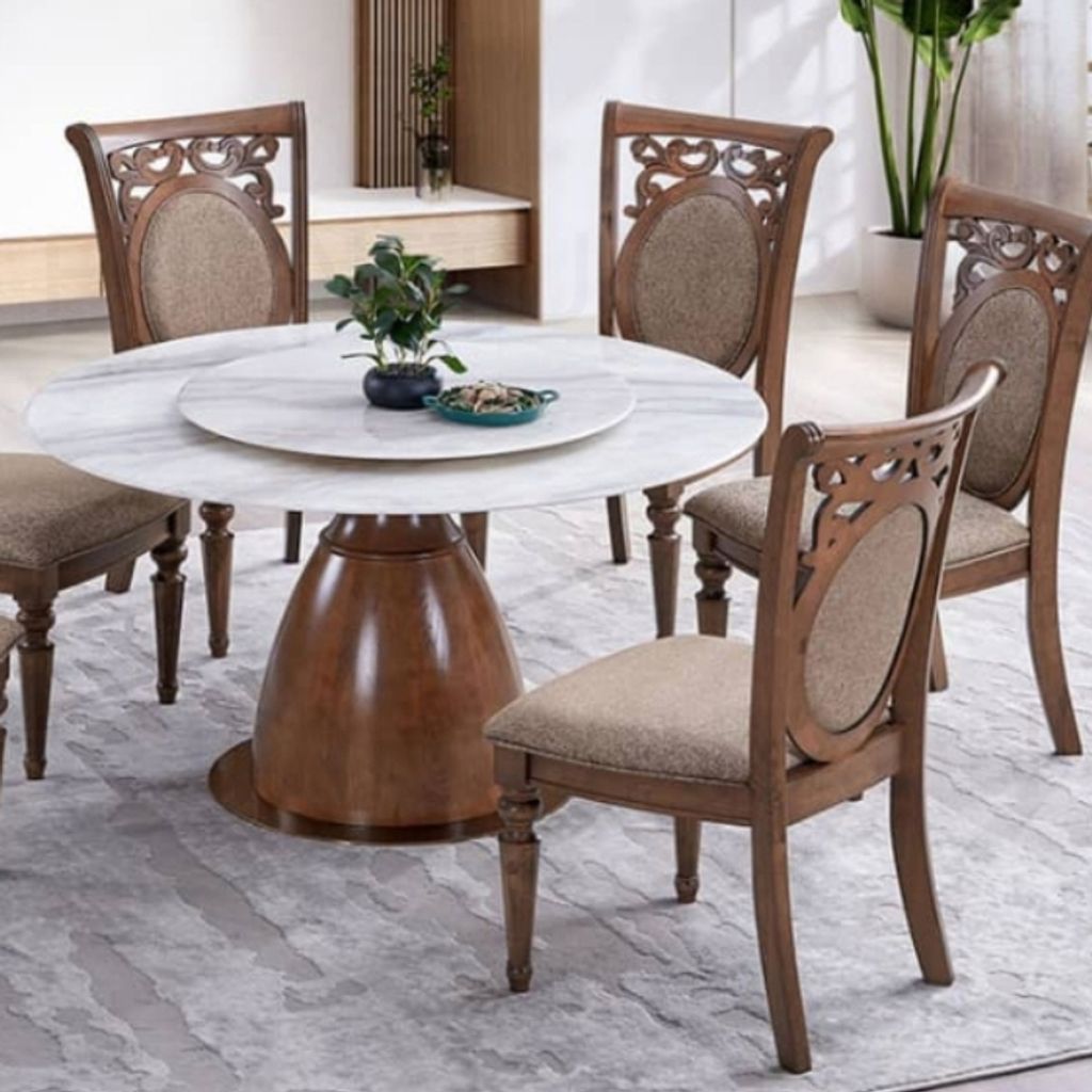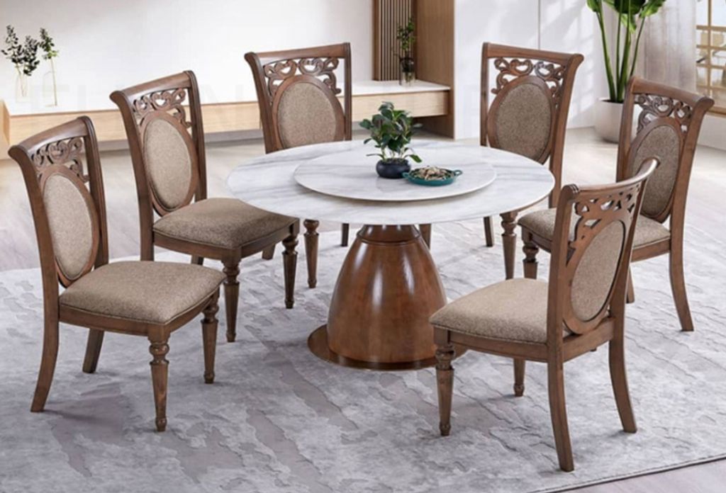 Table - H750 x Diam. 1300MM Roving Top - Diam. 700MMCrystal Marble Top + Oak Solid Wood Frame Chair - H1060/490 x D640 x W540MM Walnut