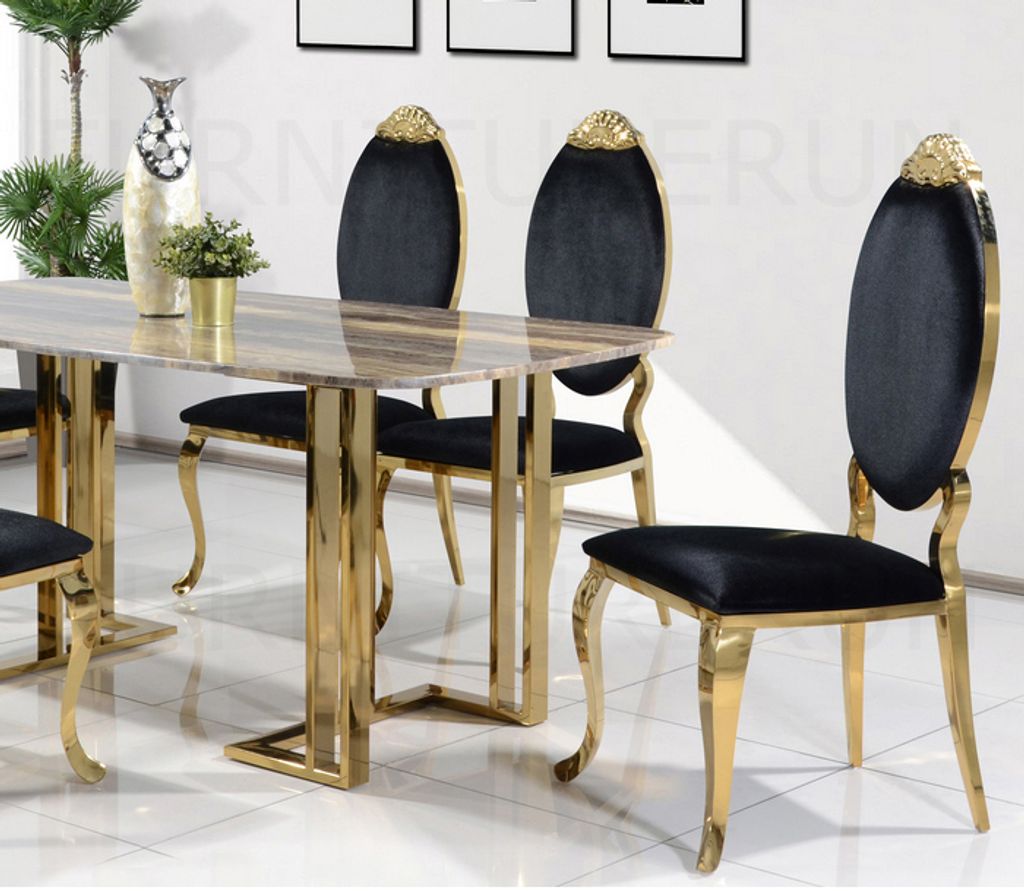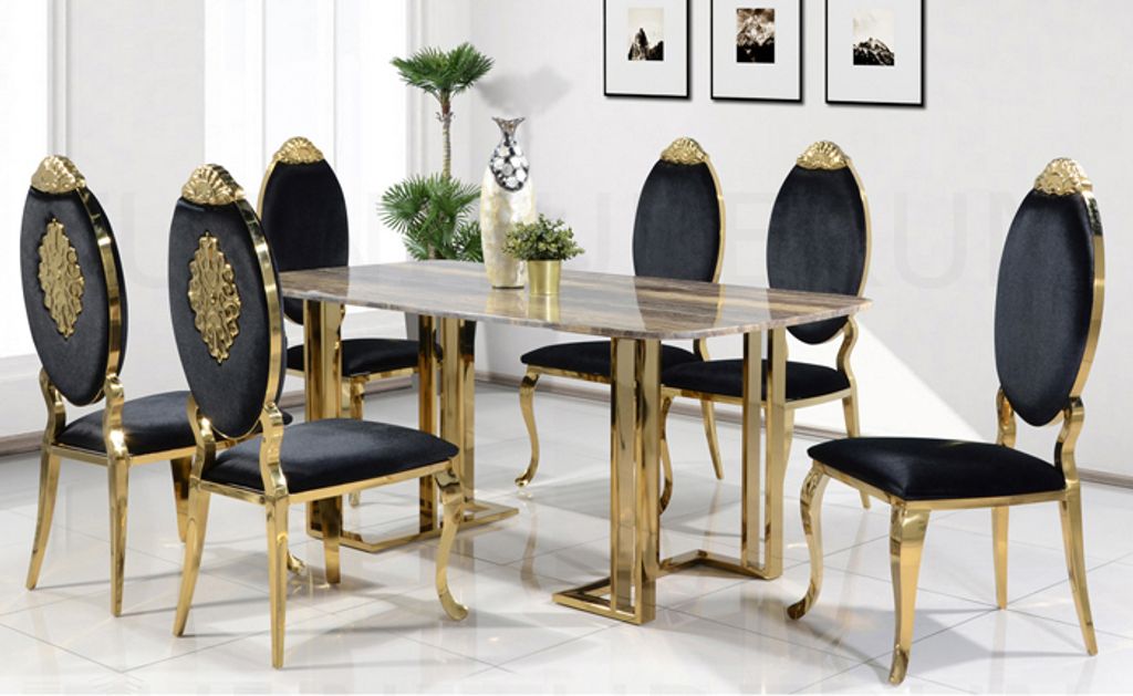 Table - H770 x D910 x W1800MM Brown Marble Top + Gold FrameChair - H1160/450 x D480 x W530MM Black Fabric + Gold Frame