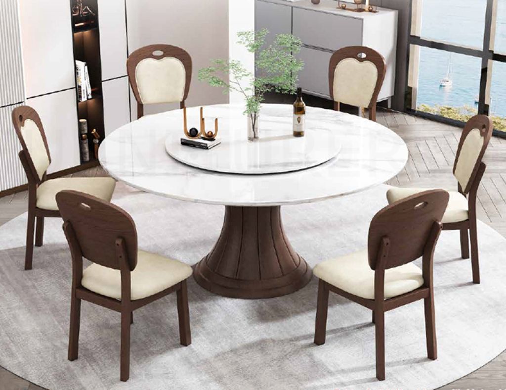Table - H750 x D1350 x W1350MMChair - H900 x D460 x W430MM Table - Solid Wood Leg with Natural Marble TopChair - Solid Wood Frame with Easy Clean Fabric