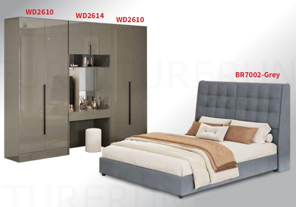 Bedframe BR7002-Grey - H1240 x D2190 x W1560MMStool - H400 x D330 x W330MMWardrobe WD2610 - H2400 x D500 x W800MMWardrobe WD2614 - H2400 x D500 x W800MMMattress not Included