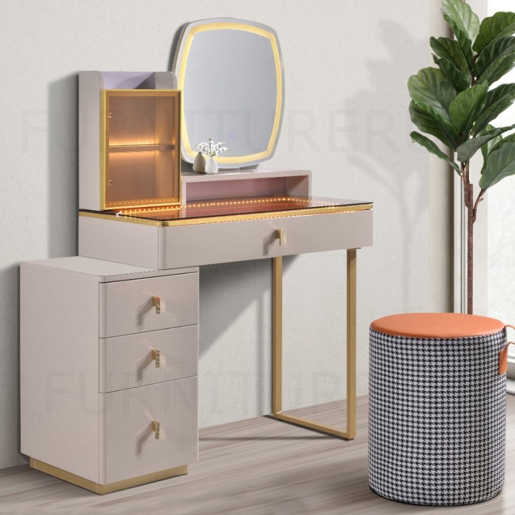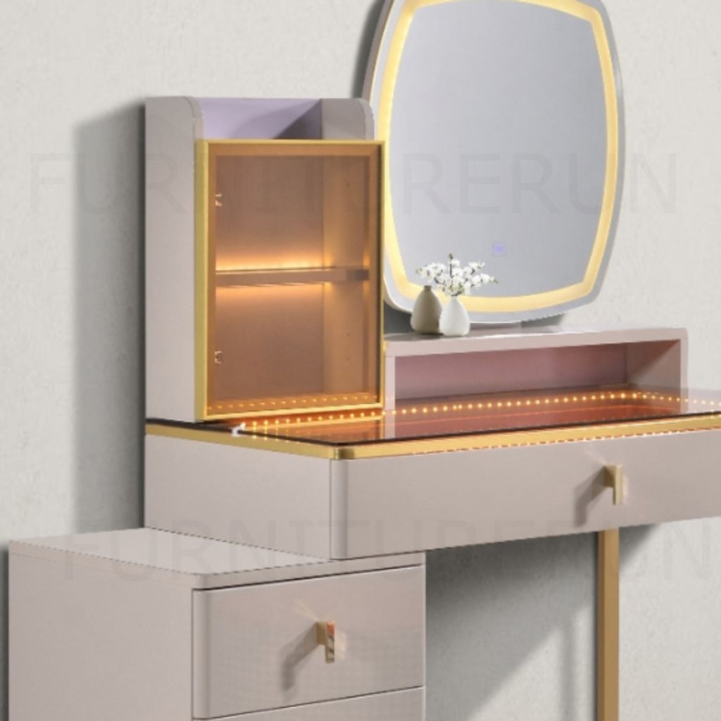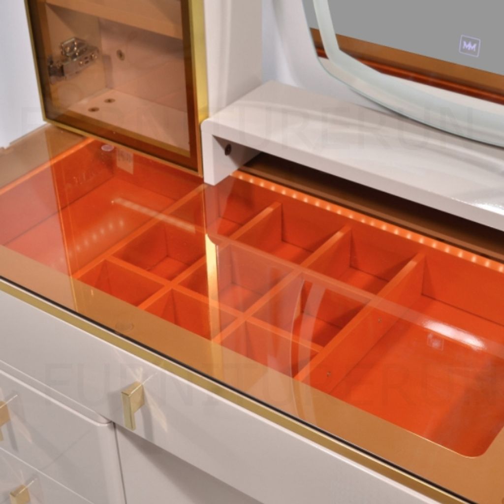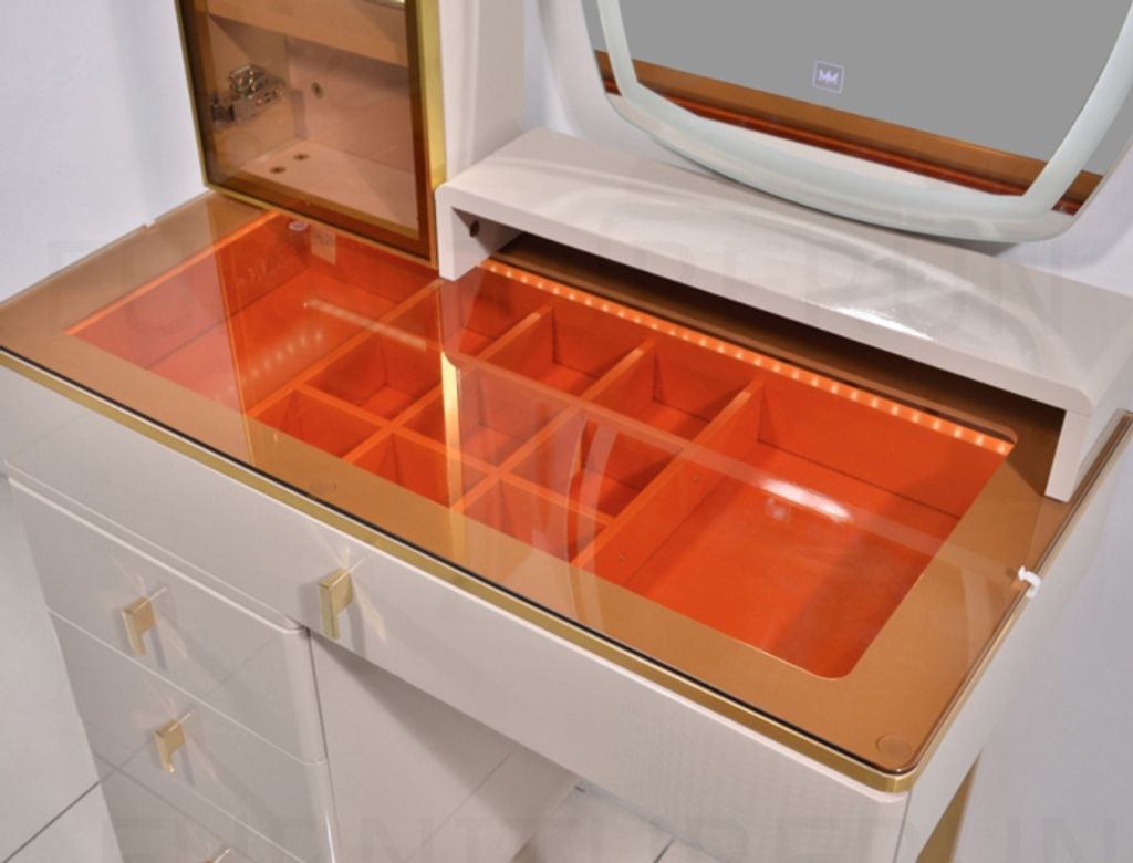 Brown Tempered Glass Top, Mirror, Stool & Metal Base