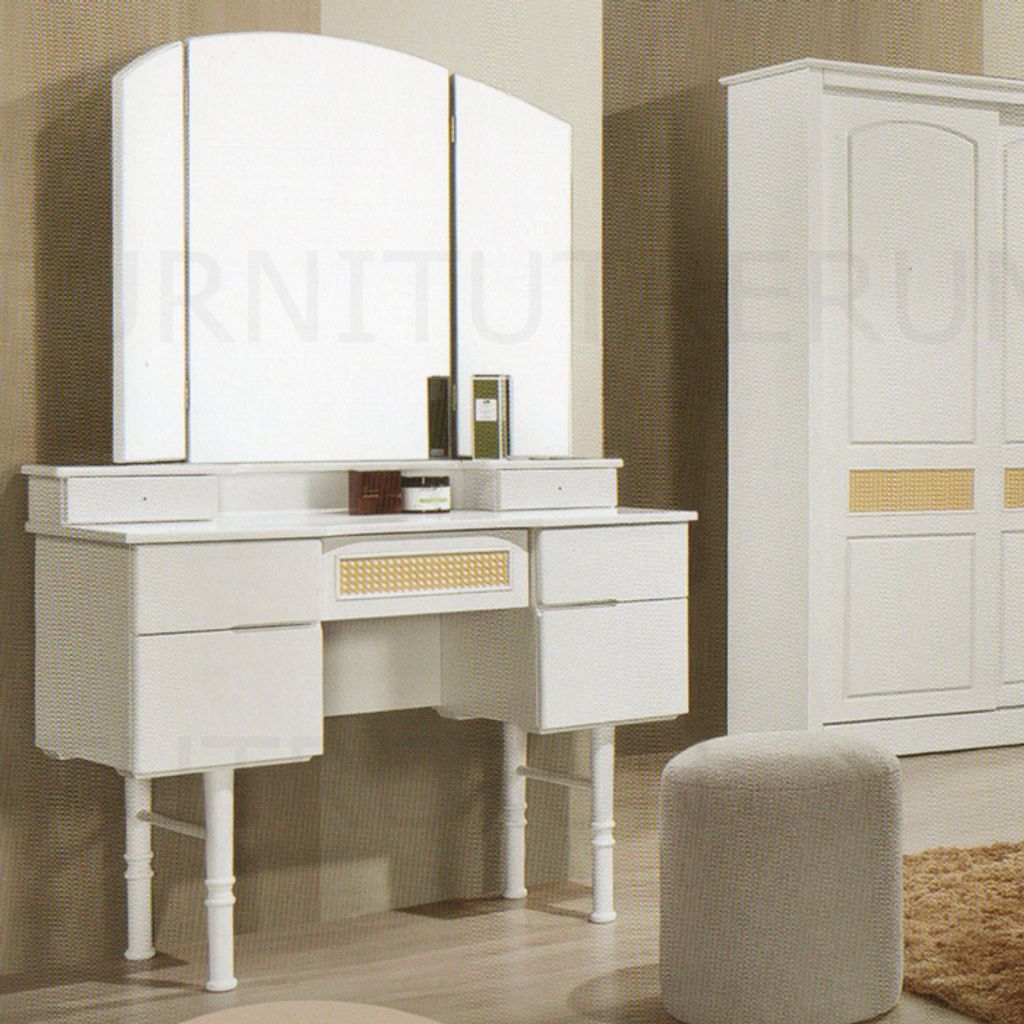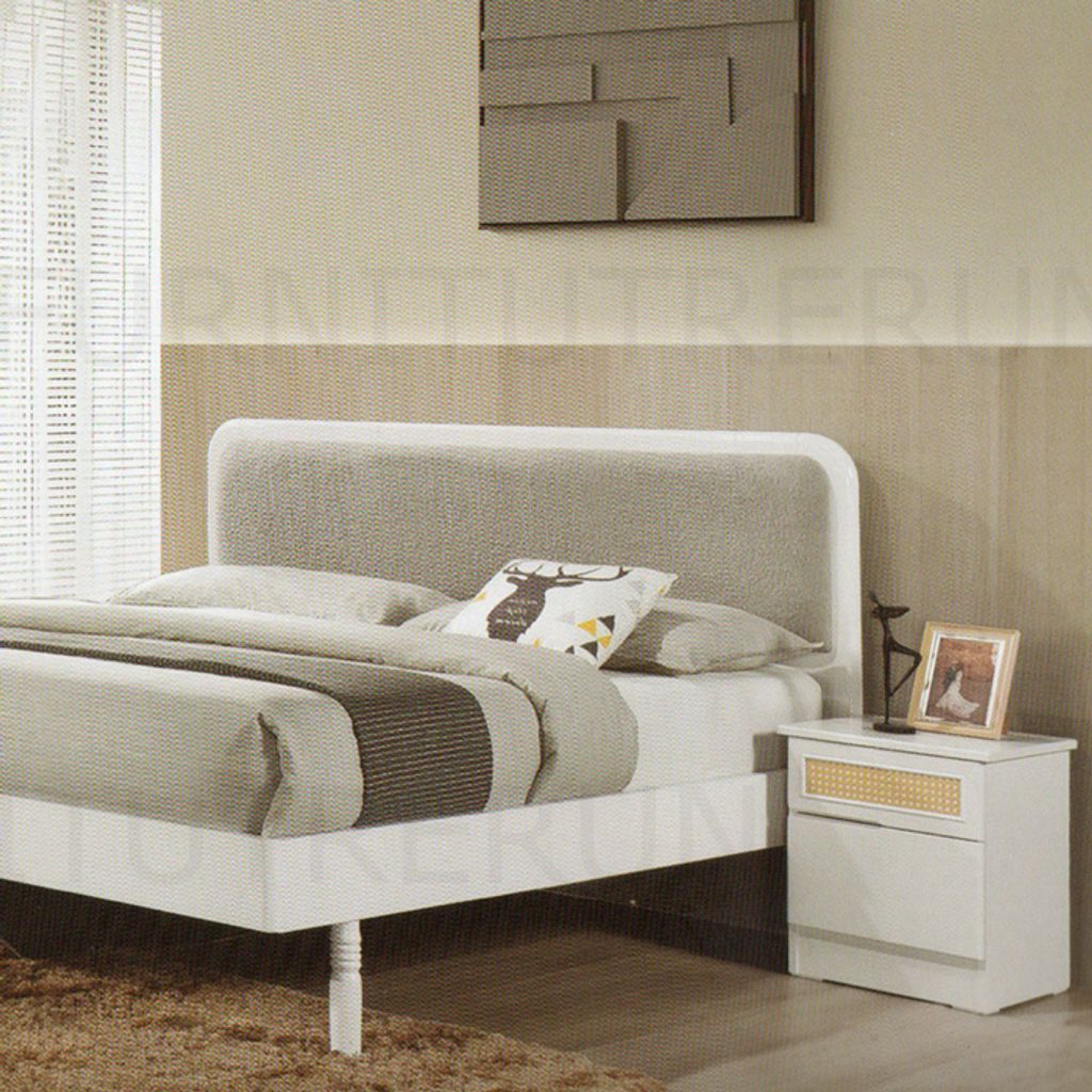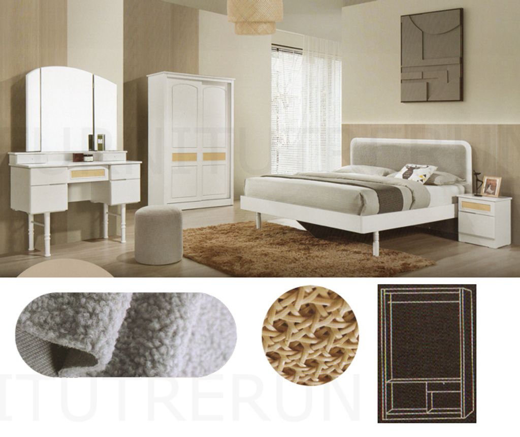 Queen B-100 - H42" x D78" x W64" White / Grey FabricDressing Table D77 - H66.5" x D16" x W42" Stool - H17" x D16" x W16" - RM 139Side Table - H19" x D16" x W16" - 1XWardobe W80 - H75" x D22" x W47" WhiteRattanGrey Fabric Mattress not Included