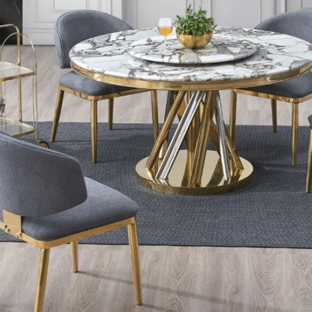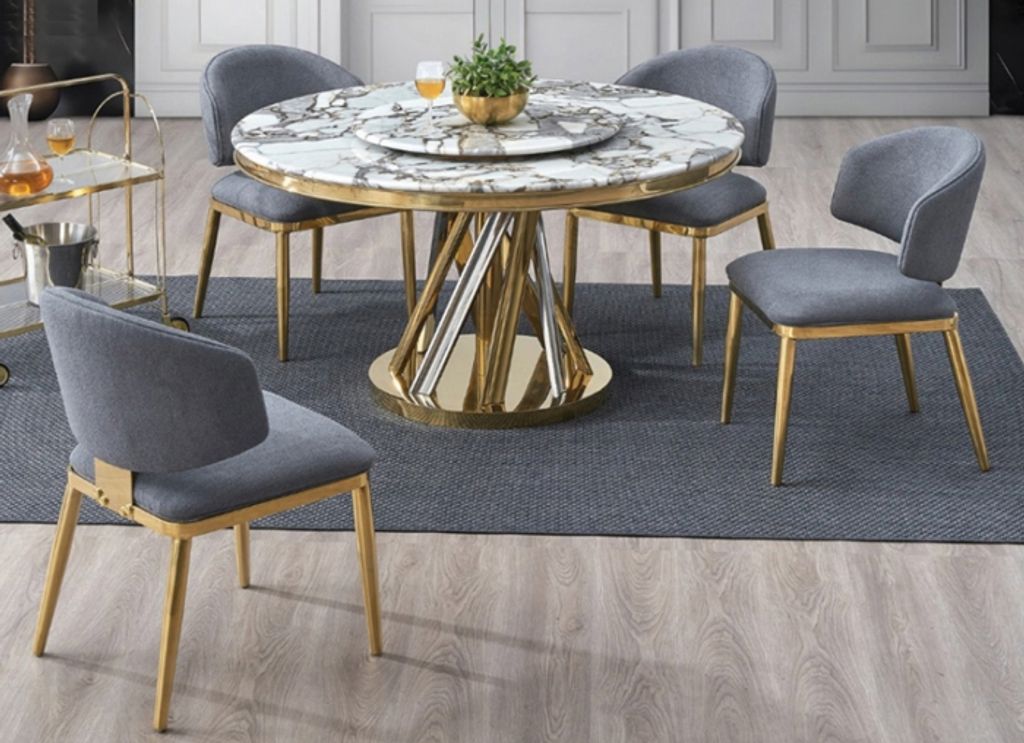 Table - H760 x Diam. 1350MM Roving Top - Diam. 700MMGrey Top + Stainless Steel Frame & GoldChair - H830 x D500 x W480MM Teddy Fabric + Sponge + Wood Plywood + Stainless Steel Frame + Gold Leg
