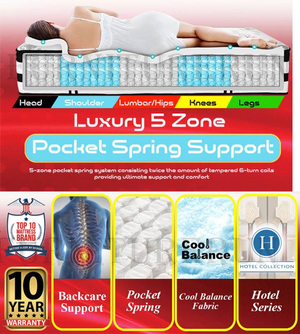 * Pillow Top 42cm Thickness* 5 zoned pocket spring* Reinforced Latex Padding* HR Foam Padding* Foambox Encased* Cool Balance Fabric* 10 Years Warranty