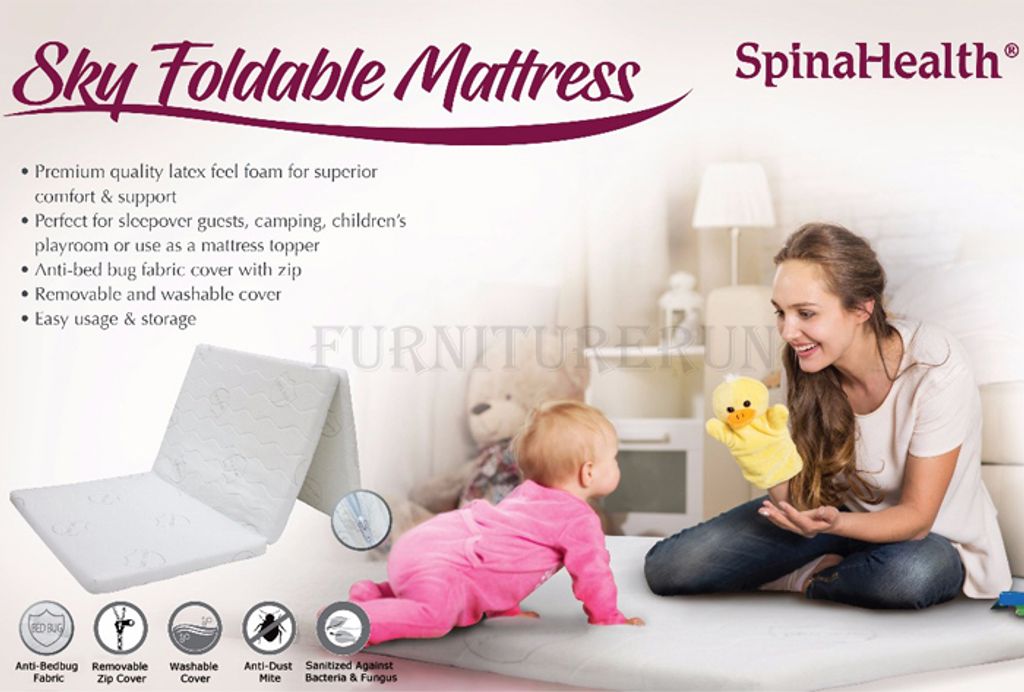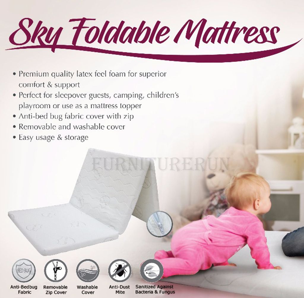 * 3' x 2.5" Sky Foldable Mattress* Latex Feel + Linen Fabric* H6 x W91 x L191CM* Anti-Bedbug Fabric* Removable Zip Cover* Washable Cover* Anti-Dust Mite* Sanitized Against Bacteria & Fungus