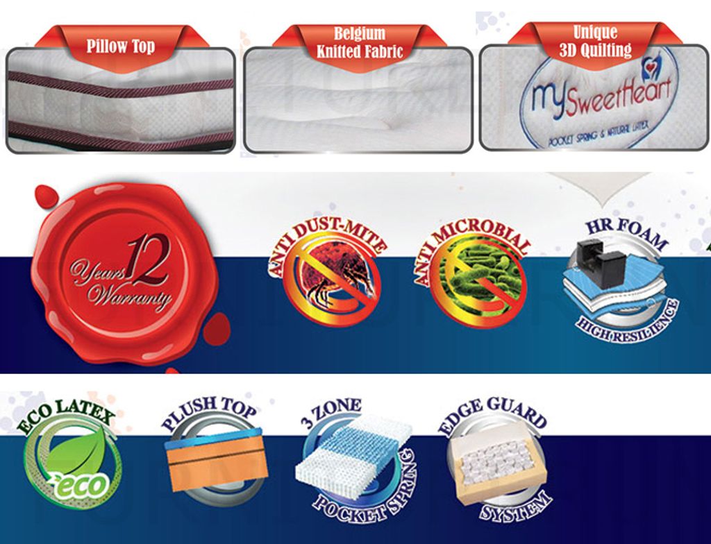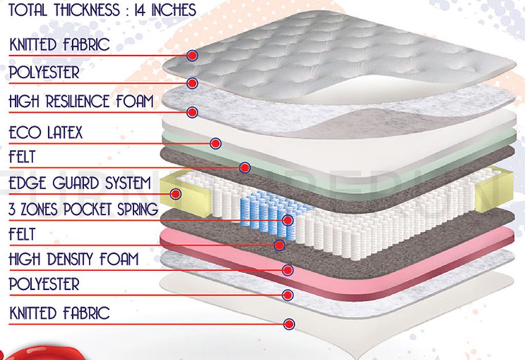 Pillow TopBelgium Knitted FabricUnique 3D QuiltingAnti-Dust MiteAnti MicrobialHigh Resilience FoamEco LatexPlush Top3-Zone Pocket SpringEdge Guard SystemThickness 14"12 Years Warranty