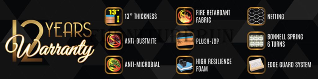 * Anti-Dustmite* Anti-Microbail* Fire Retardant Fabric* High Resilience Foam* Netting* Bonnell Spring 6 Turns* Edge Guard System* Thickness 13"* 12 Year Warranty