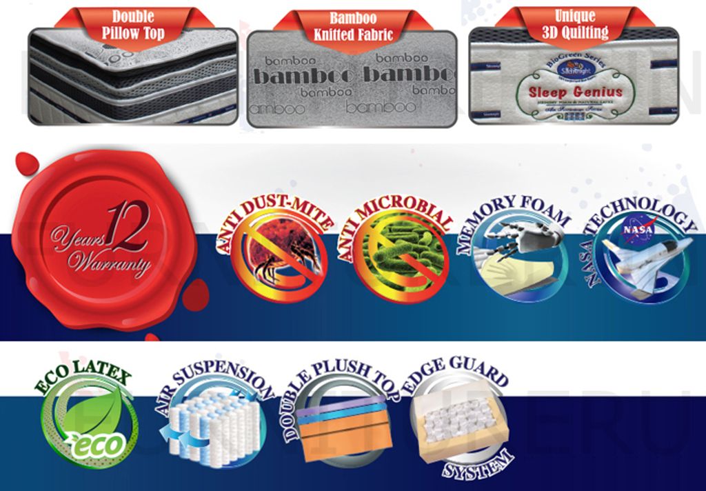 Double Pillow-TopBamboo Knitted FabricUnique 3D QuiltingAnti-Dust MiteAnti MicrobialMemory FoamEco LatexAir Suspension Multiple ZoneDouble Plush TopEdge Guard SystemThickness 15"12 Years Warranty