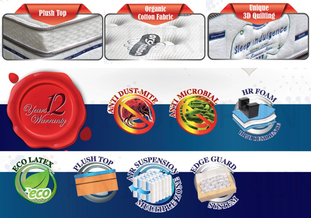 Plush-TopOrganic Cotton FabricUnique 3D QuiltingAnti-Dust MiteAnti MicrobialHigh Resilience FoamEco LatexPlush TopAir Suspension Multiple ZoneEdge Guard SystemThickness 15"12 Years Warranty