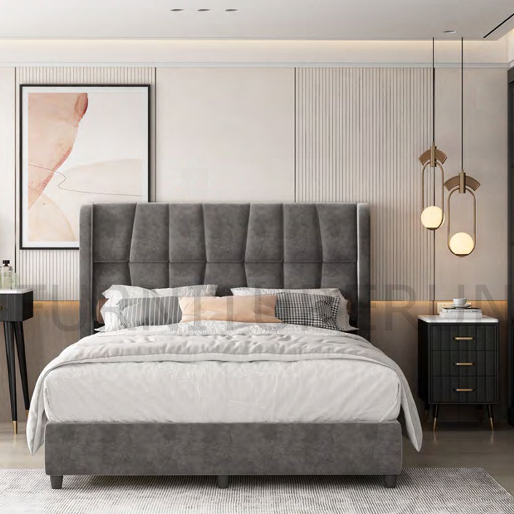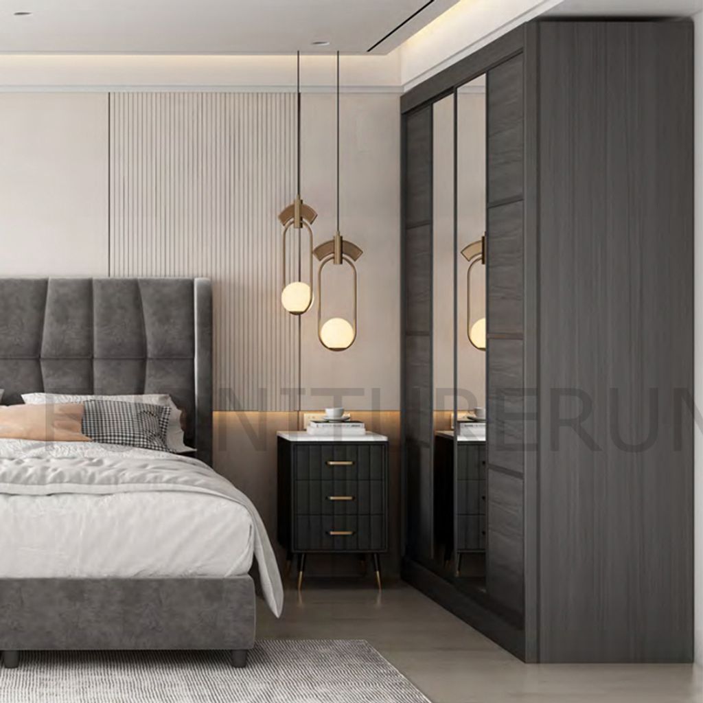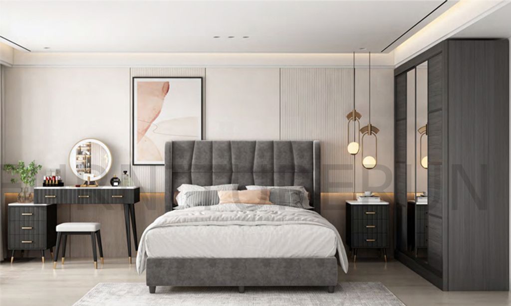 BR7001 Grey Queen - H1230 x D2100 x W1640MM WD1087 Wenge Wardrobe - H2400 x D570 x W2300MM DS120 Black Dresser Mirror - H770 x D400 x W1000MM ST004 Black Bedside - H600 x D400 x W360MM x 1