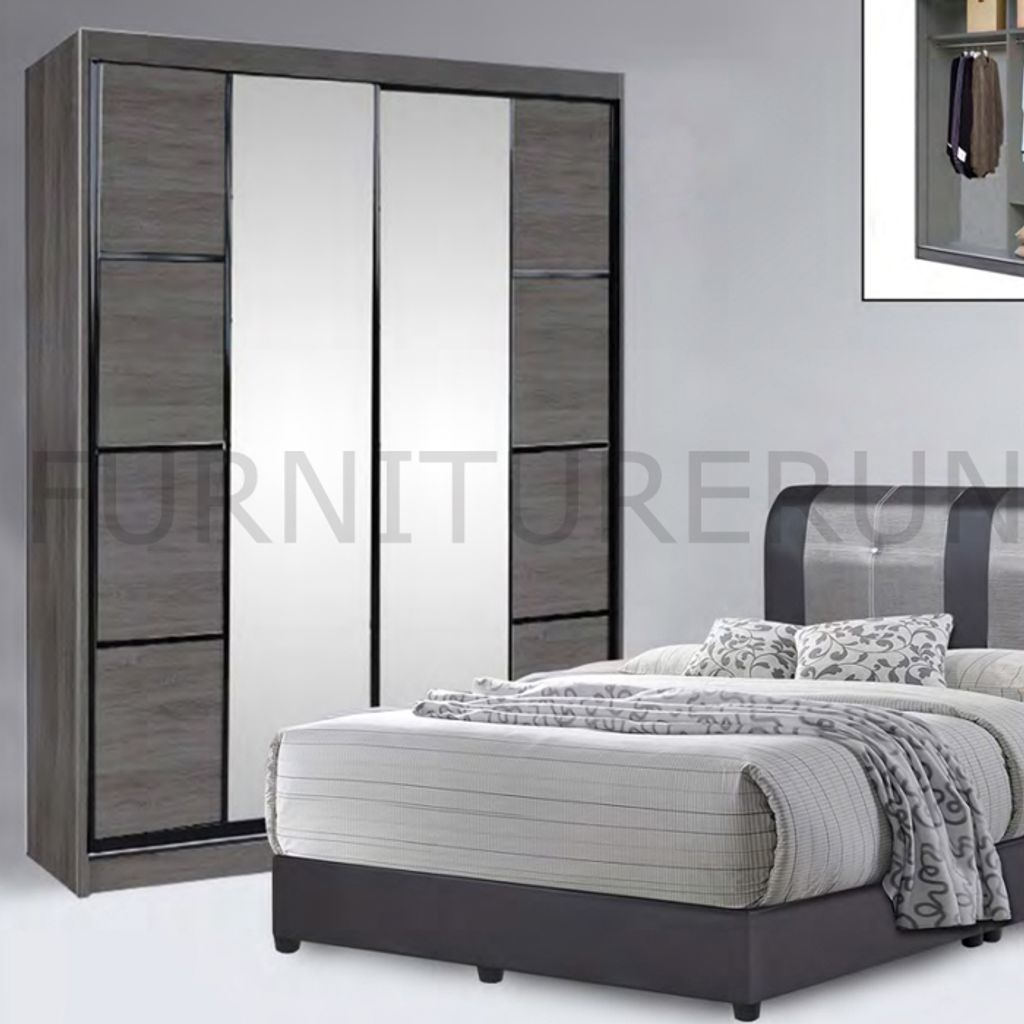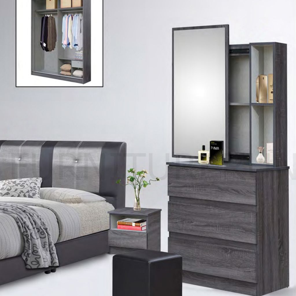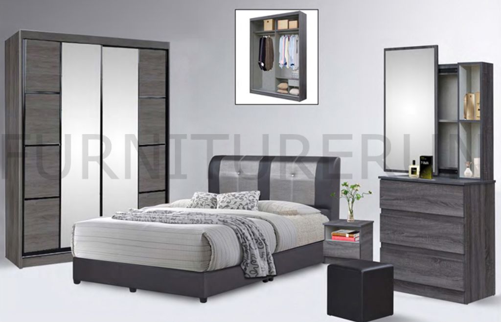 BR801 (774) Queen - H1050 x D2050 x W1530MM WD1067 Wenge Wardrobe - H2400 x D570 x W1800MM DT32 Dark Grey Dresser Mirror - H1670 x D390 x W690MM ST005 Dark Grey Bedside - H400 x D340 x W380MM x 1 Mattress not Included