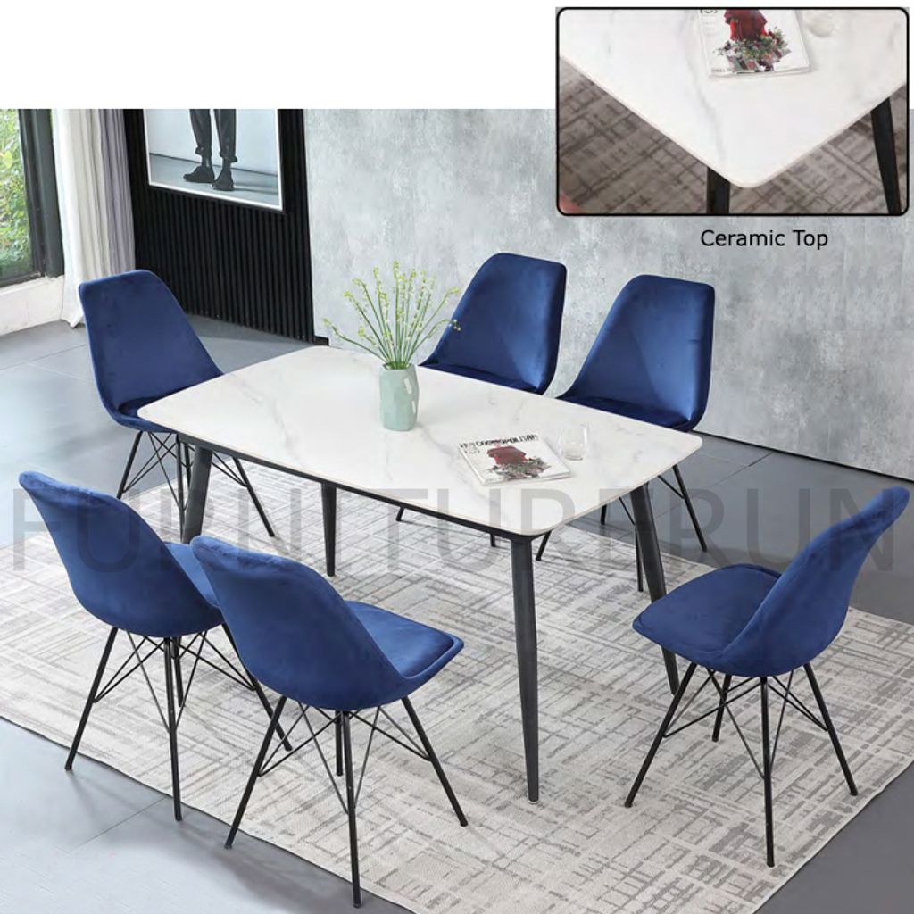Table - H760 x W800 x L1400MM Chair - H820 x D480 x W590MM Ceramic TopBlack Powder Paint Steel Table LegPremium Velvet FabricBlack Powder Paint Steel Chair Leg