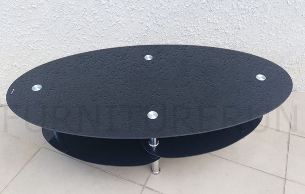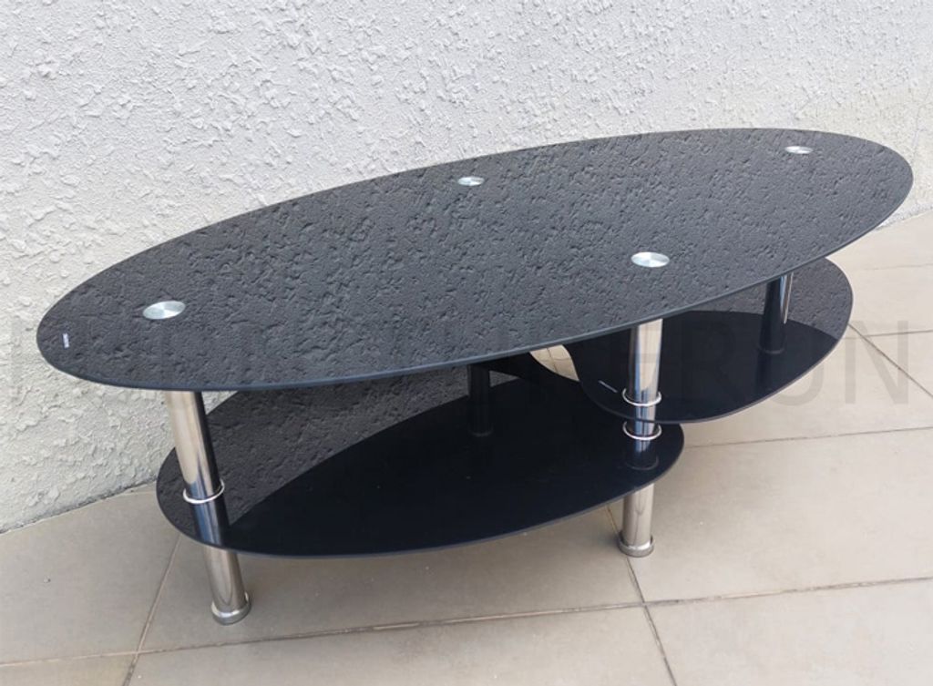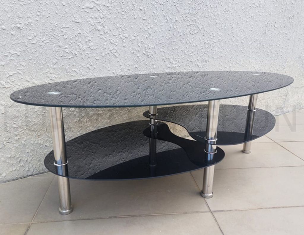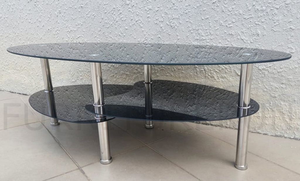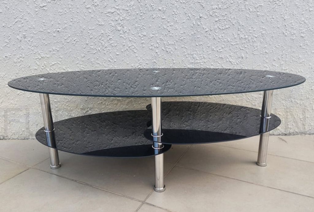 The Crystal Oval Coffee Table features three levels of beveled and sturdy chrome metal legs, to provide rugged construction while maintaining a sleek look.