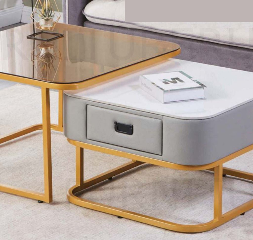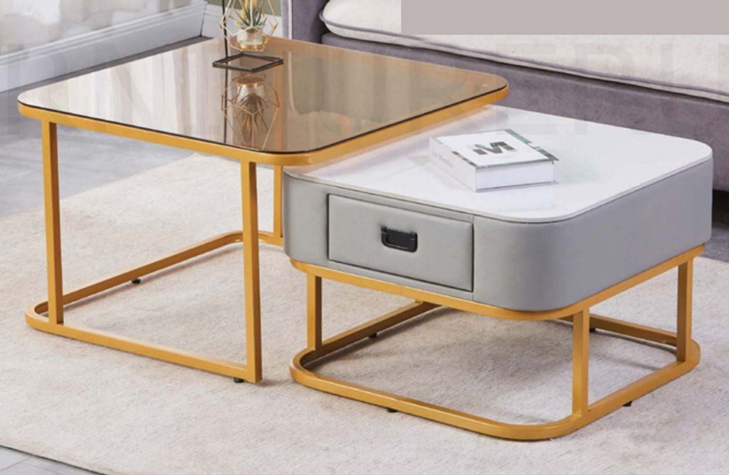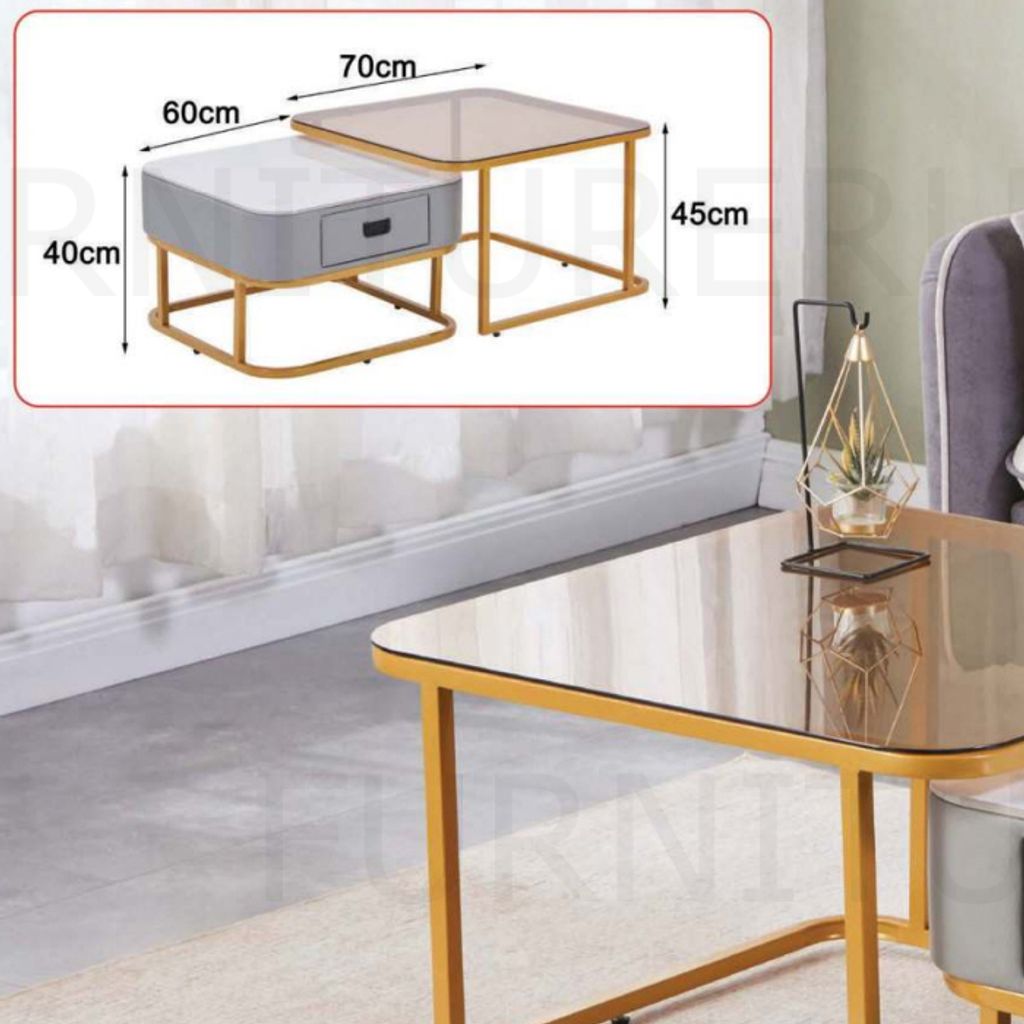 H400 x D600 x W600MM H450 x D700 x W700MM Spray Paint Gold Steel Frame + Spray Paint Grey Body with Glossy Ceramic Top and Tea Color Glass Top