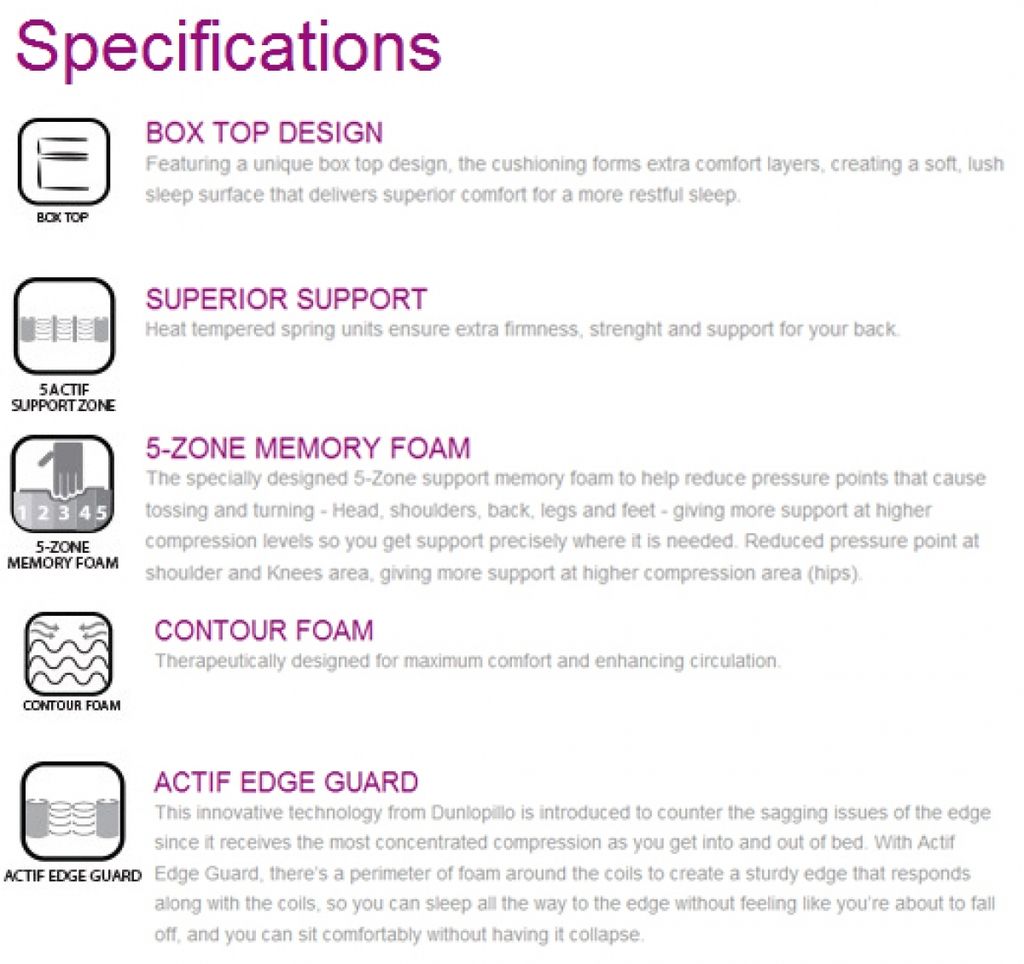 * Box top on plush top design * Duo comfort super coil * 5-zone memory foam * Actif edge guard * Hypo-Allergenic * Long lasting durability * Anti-Electrostatic * 5 Active Support Zone * Thickness 37CM