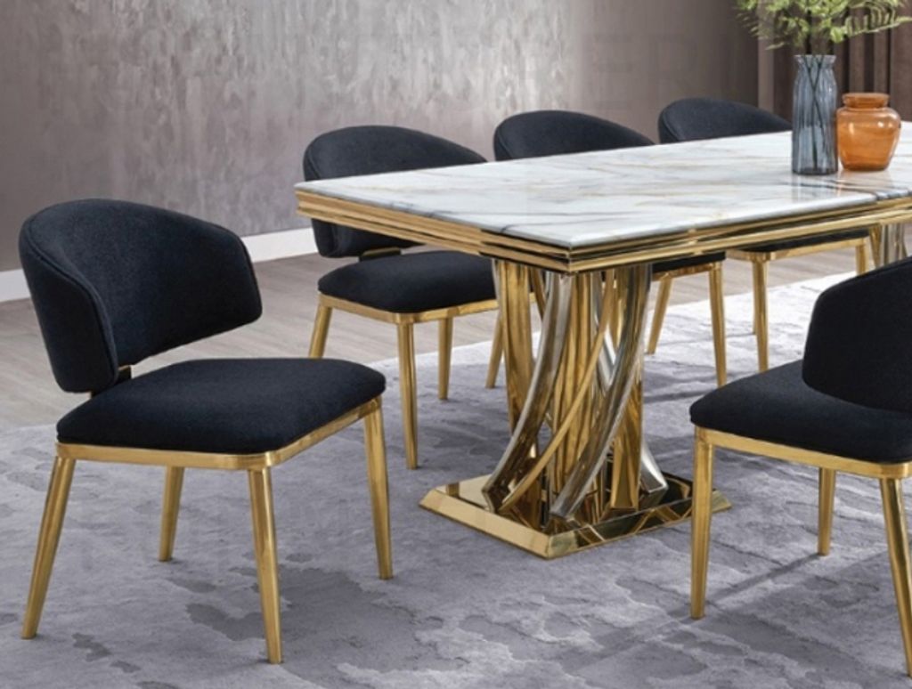 Table - H760 x D1000 x W2000MM White Top + Stainless Steel Frame GoldChair - H830 x D500 x W480MM Teddy Fabric + Sponge + Plywood + Stainless Steel Frame + Gold Leg