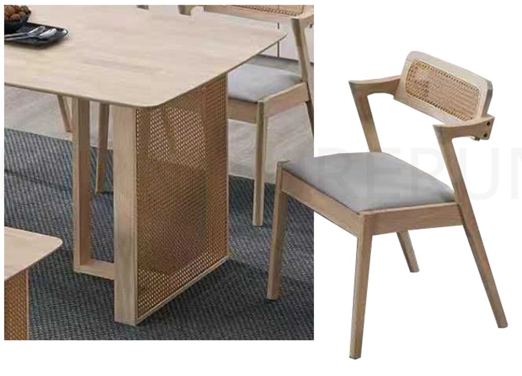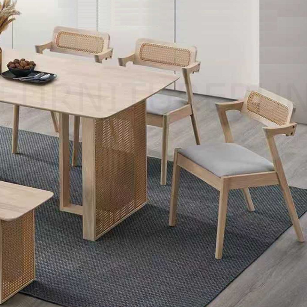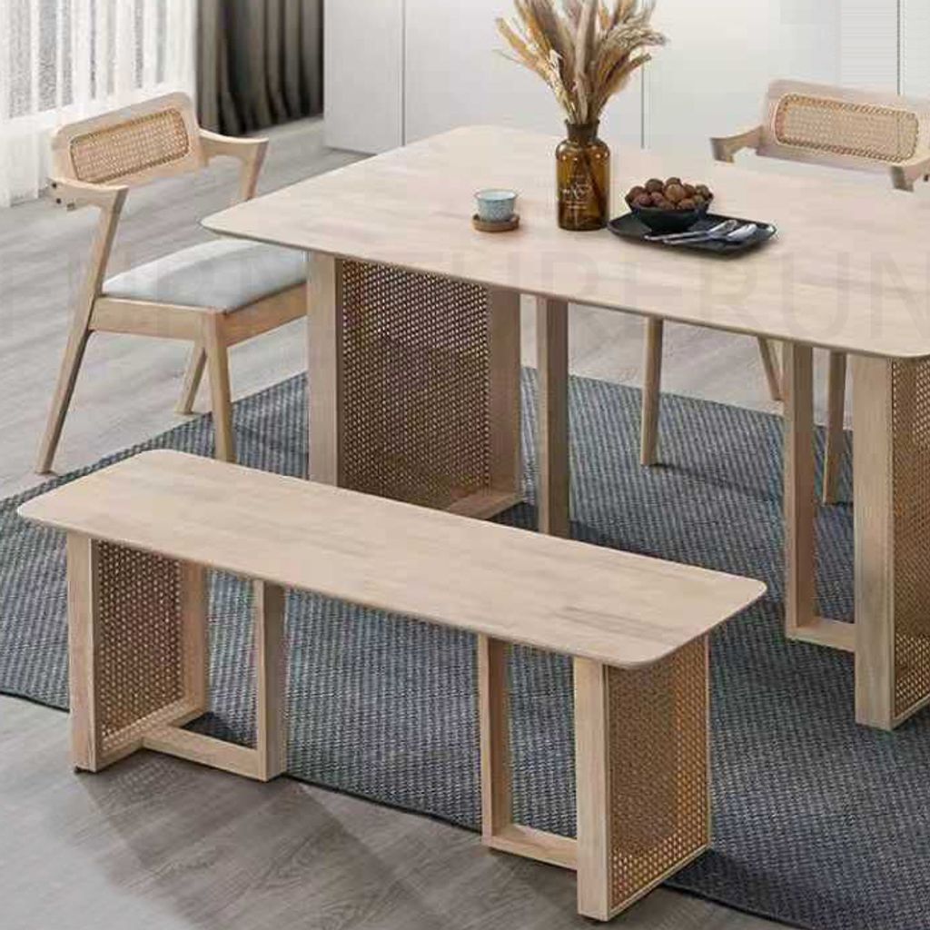 Table - H750 x D900 x W1600MMChair - H860 x D450 x W470MMBench - H450 x D380 x W1300MMSolid Rubberwood FrameSynthetic Rattan WebbingFabric Cushion Seat