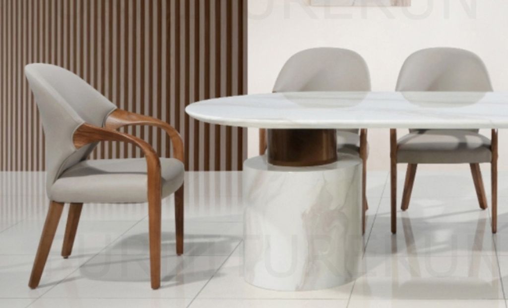 Table - H750 x D1000 x W2100MM White Marble Top + Base Stainless Steel GoldChair - H910/440 x D520 x W600MM Grey Microfiber Leather + Walnut Leg