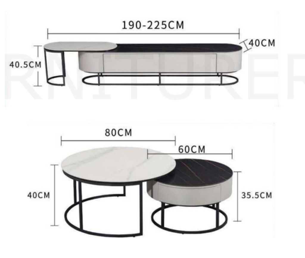 TV Cabinet - H405 x D400 x W1900/2250MMCoffee Table H355 x Diam. 600MMH400 x Diam. 800MMSpray Paint Steel Leg + Spray Paint Body with Glossy Ceramic Top