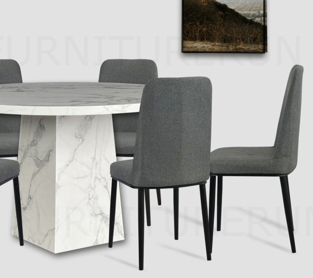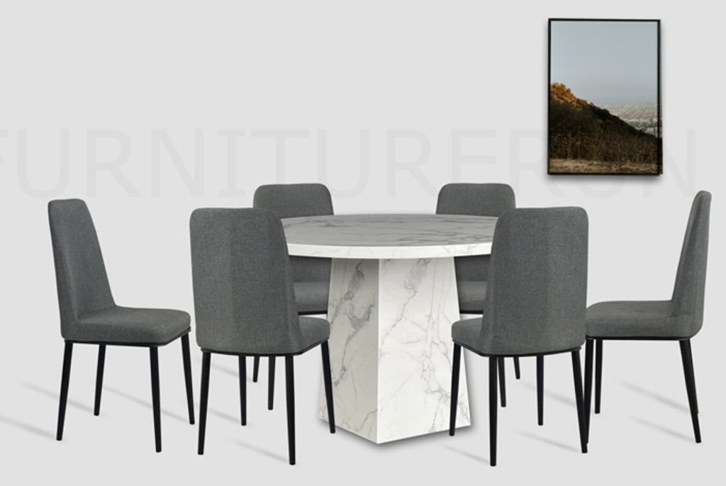 Table M14101 - H760 x D1200 x W1200MM Top T36MM / Natural Coating Marble Top & Leg Chair C205 - H930 x D430 x W420MM Fabric Seat / Black Metal Leg
